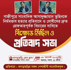 গাজীপুরে সাংবাদিক আসাদুজ্জামান তুহিনকে নির্মমভাব হত্যার প্রতিবাদে ও দোষীদের দ্রুত গ্রেফতারপূর্বক বিচারের দাবিতে বিক্ষোভ মিছিল ও প্রতিবাদ সভার আয়োজন করে, খাগড়াছড়ি প্রেসক্লাব। আজ ০৮-০৮-২৫’ইং তারিখ রোজ শুক্রবার সকাল ১১’ঘটিকায়, খাগড়াছড়ি প্রেসক্লাের সামনে। এ প্রতিবাদ সডা অনুষ্ঠিত হয়েছে। এসময় সাংবাদিকদের মধ্যে সিনিয়র নেতৃবৃন্দগন বক্তব্যে বলেন, গাজীপুরের সাংবাদিক আসাদুজ্জামান তুহিন চাঁদাবাজ বিরোধী নিউজ করা সহ চাঁদাবাজদের ছবি ও ভিডিও করা এবং সমাজিক যোগাযোগ মাধ্যম ফেইসবুকে লাইফ কারে সত্যি কথা বলা সহ জনসমূক্ষে তুলে ধরতে গিয়ে পুলিশ এবং জনতার সামনে প্রকাশে হত্যাকারীদের দ্রুত গ্রেপ্তার করে বিচারের জোর দাবী জানানো হয়েছে। খাগড়াছড়ি প্রেসক্লাবের সাধারন সম্পাদক ও বাংলাভিশনের জেলা প্রতিনিধি, সাংবাদিক প্রফুল্ল, সাংবাদিক ইউনিয়নের সভাপতি বলেন, চাঁদবাজদের বিরোদ্ধে নিউজ করা ও ফেইসবুক লাইভে কথা বলায় একটা মানুষকে জনসমূক্ষে চাঁদাবাজরা মারবে বা খুন করবে এটা কিসের ইংগিত আমরা রাষ্ট্র সহ প্রশাসনের কাছে প্রশ্ন রাখছি। সাংবাদিকতার কাজ তথ্য সংগ্রহ ও ছবি তুলে বা ভিডিও করে, দেশজনতার কাছে তুলে ধরা। সাংবাদিক ছবি – ভিডিও সহ তথ্য সংগ্রহ প্রচার করতে গিয়ে যদি হত্যার স্বীকার হতে হয়। যেখানে একজন সাংবাদিক প্রকাশে হত্যার পর হত্যাকারীরা নিরাপদে পালিয়ে যেতে সক্ষম হয়, এমন ঘটনায় জাতি কি ম্যাসেজ পাবে বা পাচ্ছে বলে প্রশ্ন রেখেন। এবং ভবিষ্যতে রাষ্ট্র সহ প্রশাসন এ বিষয়ে আরো সজাগ থেকে প্রয়োজনীয় ব্যবস্থা গ্রহণ করবেন বলে আশা প্রকাশ করেন বক্তারা। তারা আরো বলেন, অতি দ্রুত সময়ের মধ্যে অপরাধীদের গ্রেফতার করে কঠিন শান্তির দাবী জানানো হয়। উক্ত প্রতিবাদ সভায় খাগড়াছড়ি জেলার সকল পেশাজীবী সাংবাদিকবৃন্দ উপস্থিত ছিলপন।