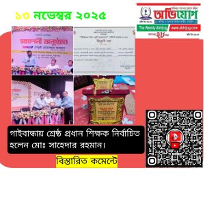 বৃহস্পতিবার (১৩ নভেম্বর ) গাইবান্ধা জেলা প্রশাসনের আয়োজনে ,জেলা পরিষদ এর সহযোগিতায়, জেলা শিল্পকলা একাডেমী মিলনায়তনে নীতিবান শিশু, সুখি বাংলাদেশ’ পাইলট প্রকল্প সমাপনী অনুষ্ঠানে ২০২৫ অনুষ্ঠিত হয়েছে। অনুষ্ঠানের প্রধান অতিথি হিসেবে উপস্থিত ছিলেন জেলা প্রশাসক মোয়াজ্জেম হোসেন। এতে প্রাথমিক বিদ্যালয় পর্যায়ে শিক্ষার্থীদের নৈতিকতা উন্নয়নের মাধ্যমে সুনাগরিক হিসাবে গড়ে তোলার লক্ষ্যে পাইলট প্রকল্প ‘ উপজেলা এবং জেলা উভয় পর্যায়ে শ্রেষ্ঠ প্রধান শিক্ষক নির্বাচিত হয়েছে সাহেদার রহমান ।